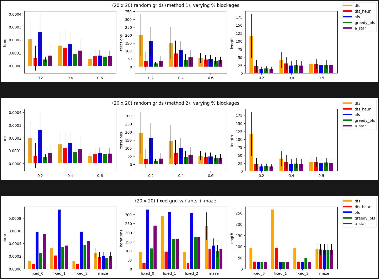 BFS really struggles with dense grids, as denoted by the low percent blockage random grids. DFS really struggles with Maze grid, which has deep but invalid paths. This shouldn't be horribly surprising, but it's interesting that this arises empirically. By chance in the Fixed grids, DFS finds the target incredibly quickly. These are simply there to highlight some expected issues with each algorithm, and see how they behave, versus inducing randomness. Adding a simple heuristic drastically helps on dense grids and mazes. A* seems to struggle quite a bit on dense grids as well, but excels on sparse grids, and regardless, we are guaranteed an optimal path. It seems like a great tradeoff between efficiency and optimality.